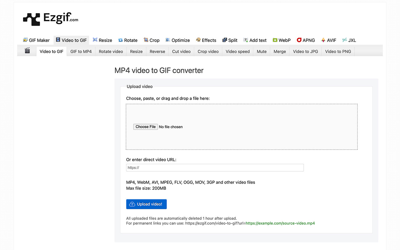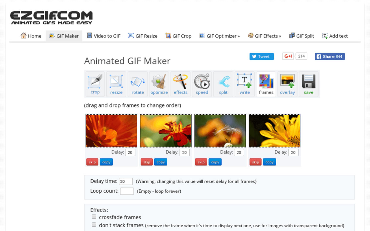Ezgif is the go-to quick tool for making and fixing animated images when you do not want to boot a heavyweight editor. The site bundles a GIF Maker, Video to GIF converters, resizers, optimizers and a decent Effects set so you can crop, speed up, reverse, or add text without fuss. It is browser based, free, and lets you get a usable asset in minutes.