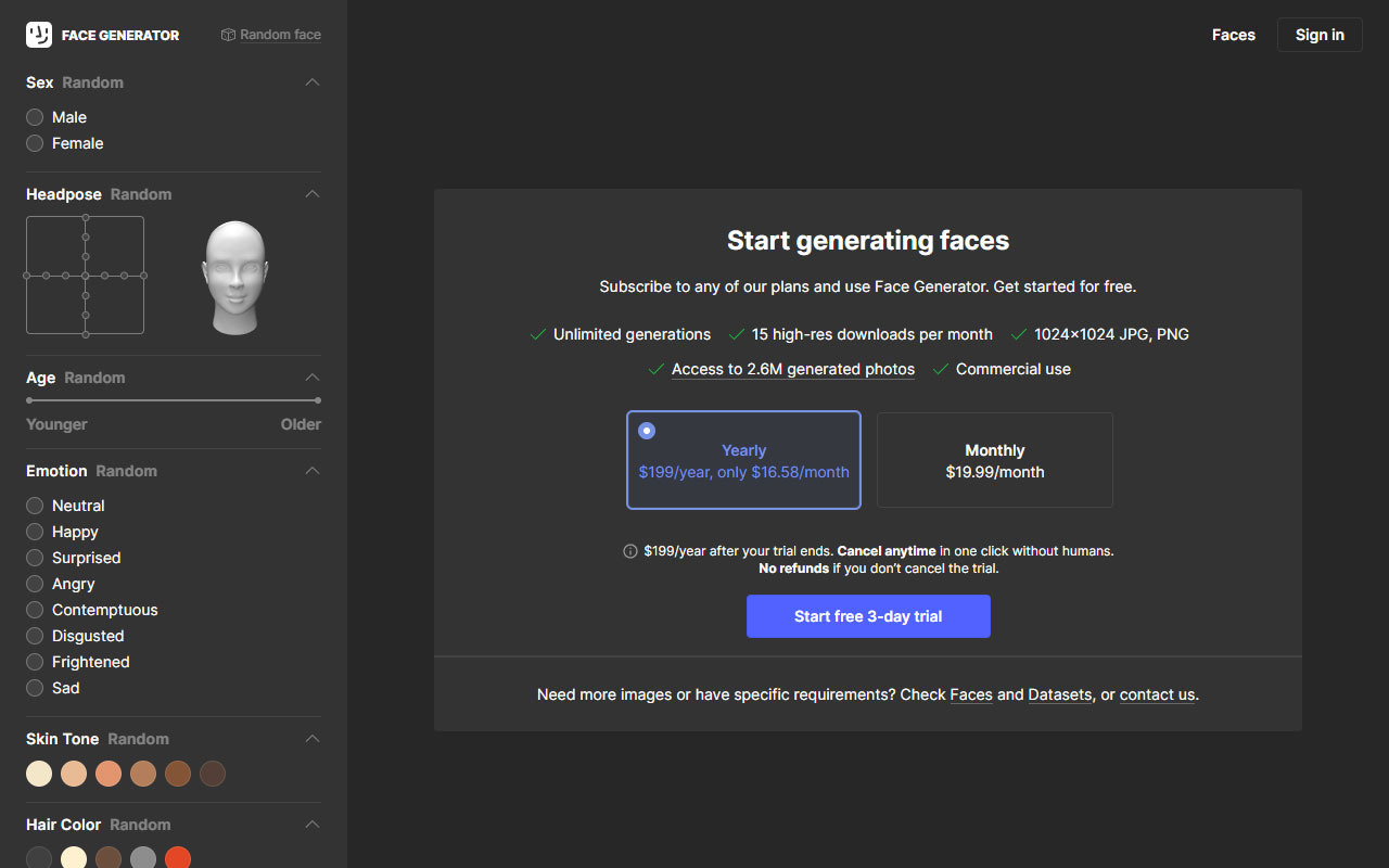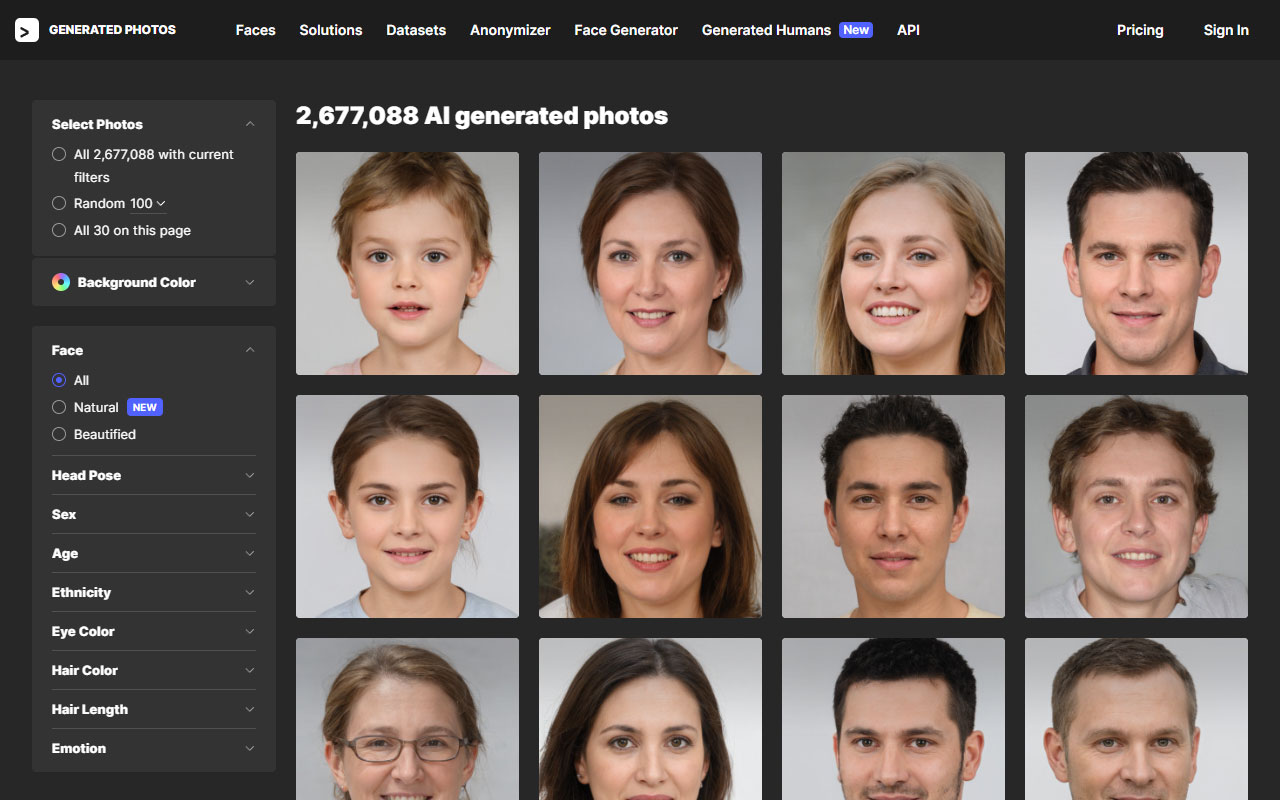 Explore a vast collection of customizable, AI-generated faces and models for creative and commercial use.